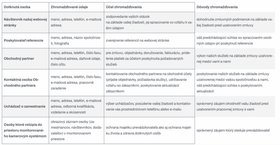 Spracúvame iba také osobné údaje, aby sme Vám mohli poskytovať naše služby, jednotlivé produkty a zákaznícku podporu, aby sme dodržali naše zákonné povinnosti, a tiež, aby sme chránili naše oprávnené záujmy. Zhromažďujeme osobné údaje o osobách, ktoré majú o naše služby záujem, alebo ktoré nám dali súhlas, aby sme ich mohli s ponukou produktov a služieb oslovovať.